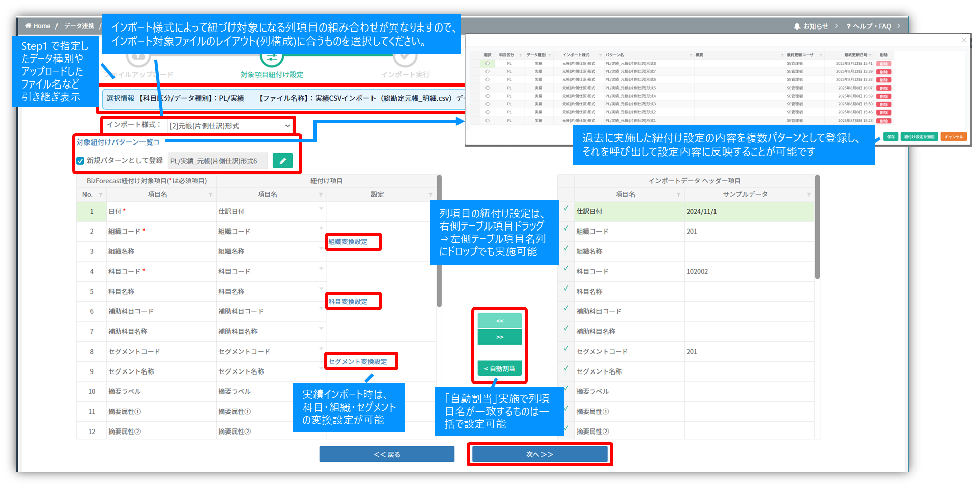 | 28 | 貸方セグメントコード | セグメント変換設定: BizForecast上のセグメントとインポートファイルのセグメントが異なる場合、 コードや名称で変換設定が可能 |