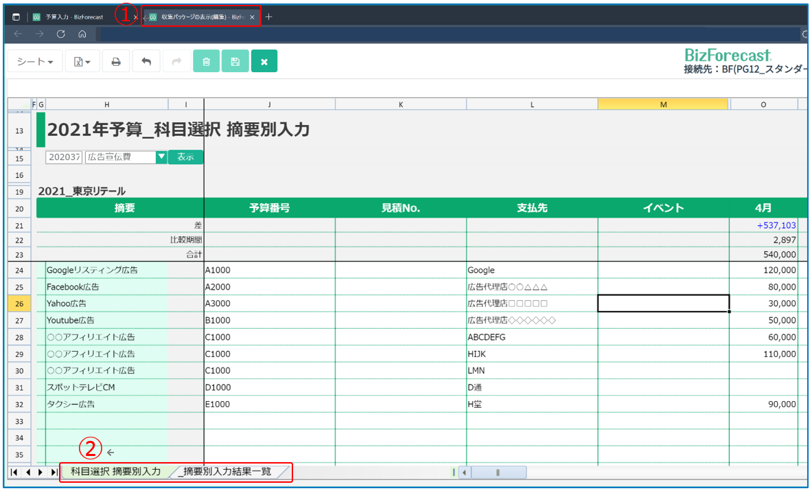 予算入力、実績・見込入力のパッケージの内、科目選択 →「表示」ボタン押下 → 明細入力 するタイプのパッケージについては、Excel出力時に表示中の科目の情報のみが出力対象になります。ダウンロードしたExcel上で科目の選択(切り替え)が出来ませんので、ご留意ください。