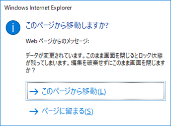 編集中の場合は、ページ移動確認ダイアログが表示されます。編集権を解除して閉じる場合は、「ページに留まる」を選択し、上記「変更を破棄」を行ってから閉じてください。「このページから移動」を選択すると、編集権が残ったまま閉じられます。再度パッケージを開いた時、または収集進捗管理画面で編集権の解除を行ってください。