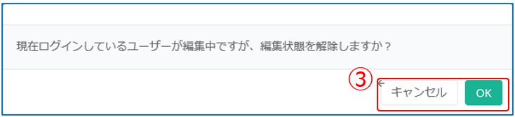 ③ 他のユーザーが編集中の際は、編集解除の確認ダイアログが表示されます。「OK」を押すと「編集解除」が行われます。「キャンセル」を押すと画面上部にメッセージが表示され、パッケージの編集はできません。