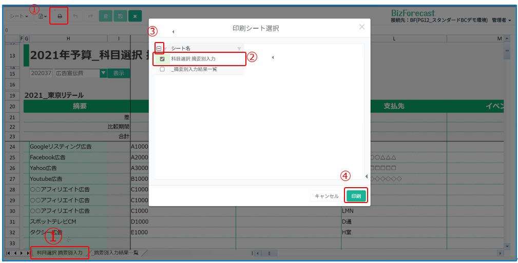 BizForecastの印刷機能を使用して、表示している収集パッケージを印刷することができます。ブラウザの印刷機能では、現在表示されているページ全体しか印刷されません。収集パッケージ内のシートをブラウザから直接印刷する場合は、BizForecastの印刷機能を使用してください。