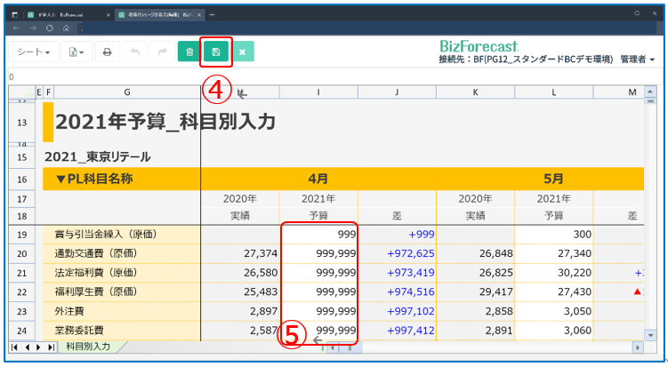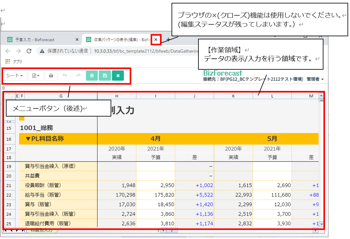 Excel出力(保護なし)は、二次利用が目的の機能です。Excel出力後に行列挿入やシート追加、関数式の追加や変更など可能ですので、自社報告フォーマットのレポートに転記(加工)したり、関数など追加した場合は計算結果をBizForecastの入力欄にまとめて貼り付けする等の用途でご利用いただけます。