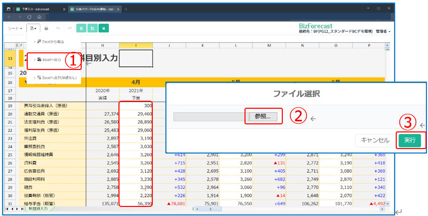 Excel出力は主に代理入力に利用します。BizForecastを何らかの事情で使用できないユーザーにExcelファイルでデータの入力を行ってもらい、そのExcelファイルを取り込むことでデータを入力することができます。