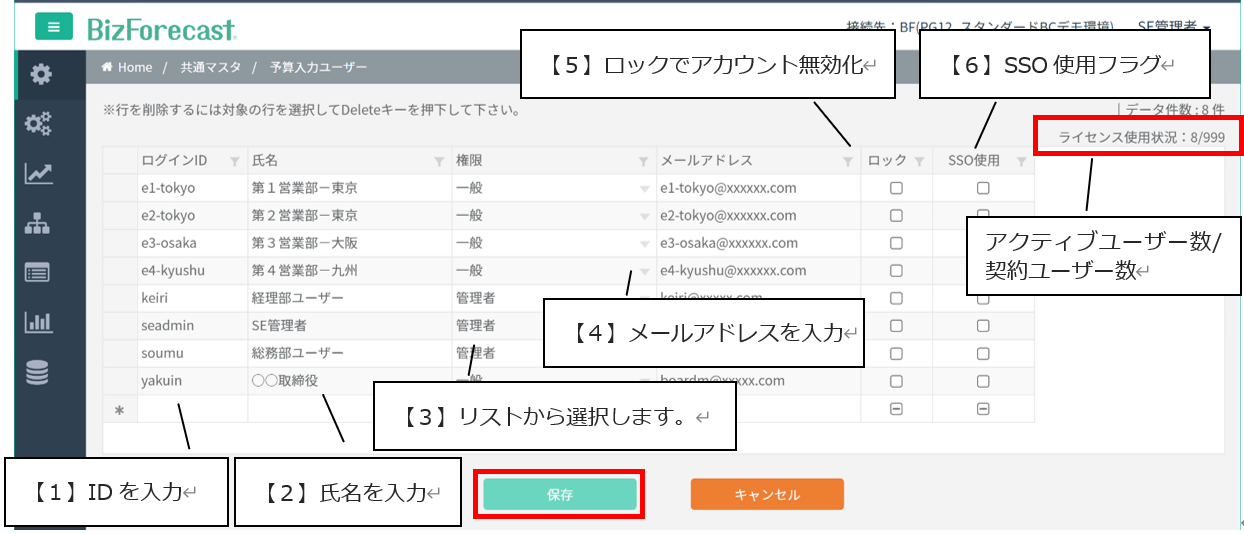 該当のユーザーでマスタの登録や予算データ登録など実施していない場合は、削除したいユーザー行を選択した上で「Delete」キーを押下(&保存)することで物理削除が可能です。