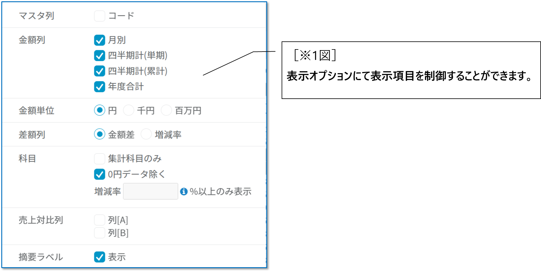 [2] 金額列 : 「月別」「四半期計(単期)」「四半期(累計)」「年度合計」 ※チェックボックスで各々選択