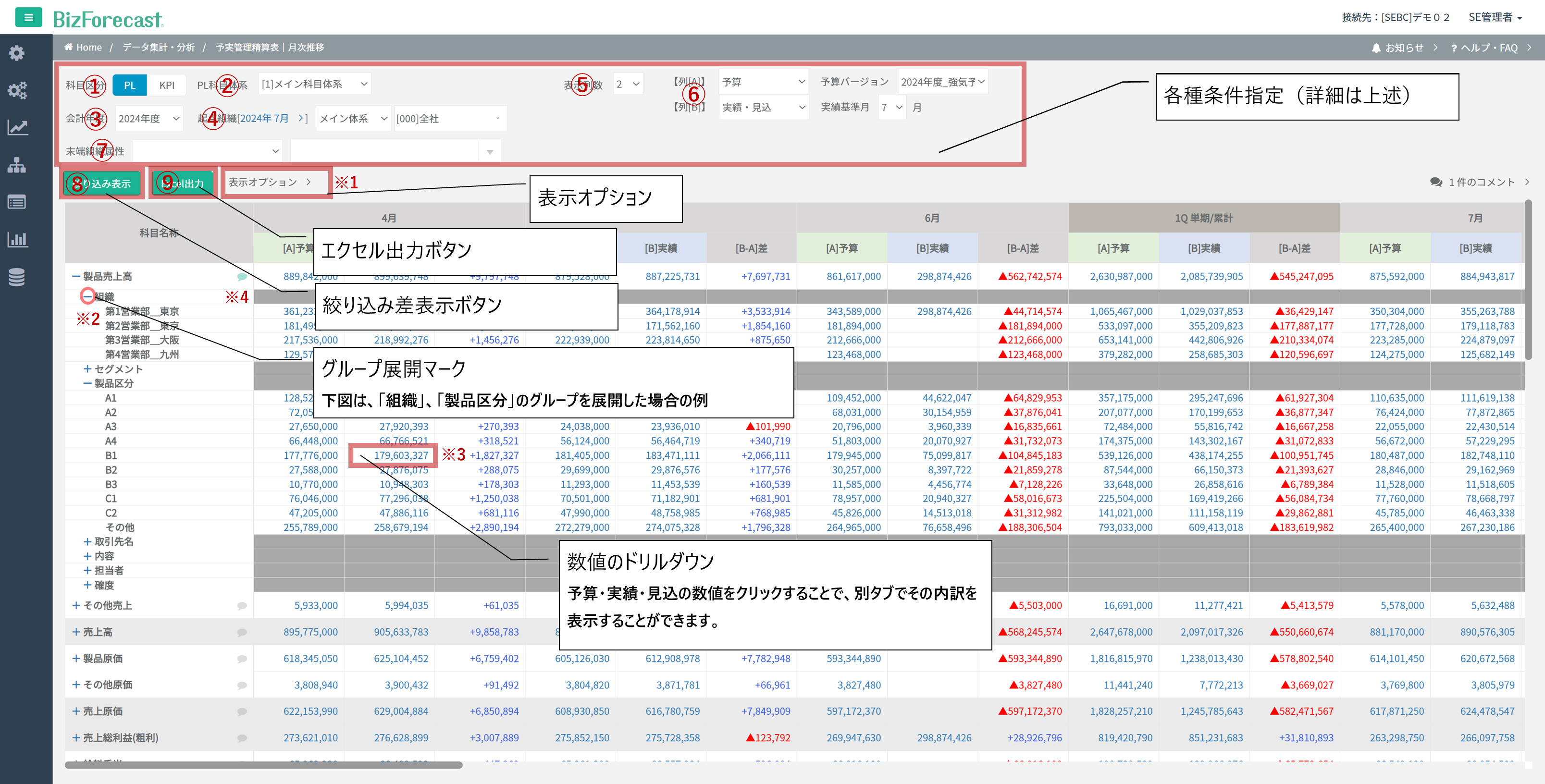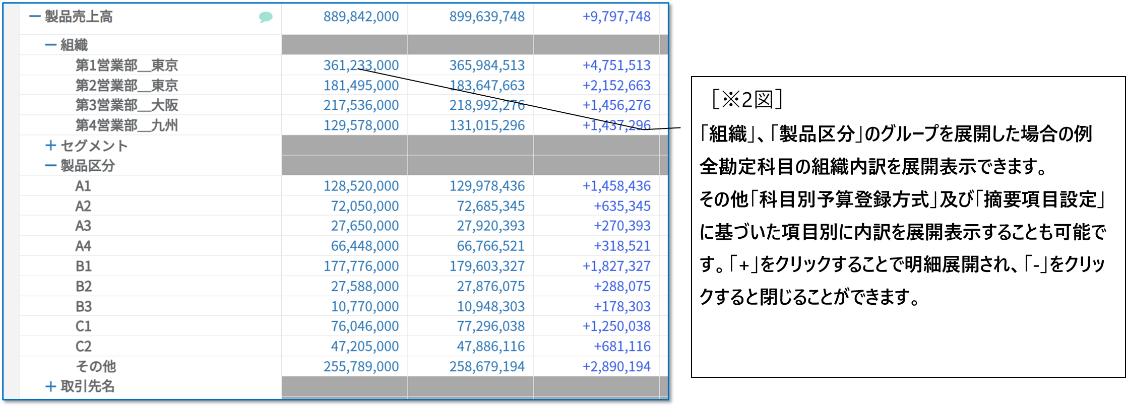 勘定科目(PL・KPI)ごとの予算・実績・見込データを組織・セグメントや摘要明細単位で月次集計し、各月ごとに対比形式で表示します。「+」部分をクリックすることで内訳明細を表示できます。