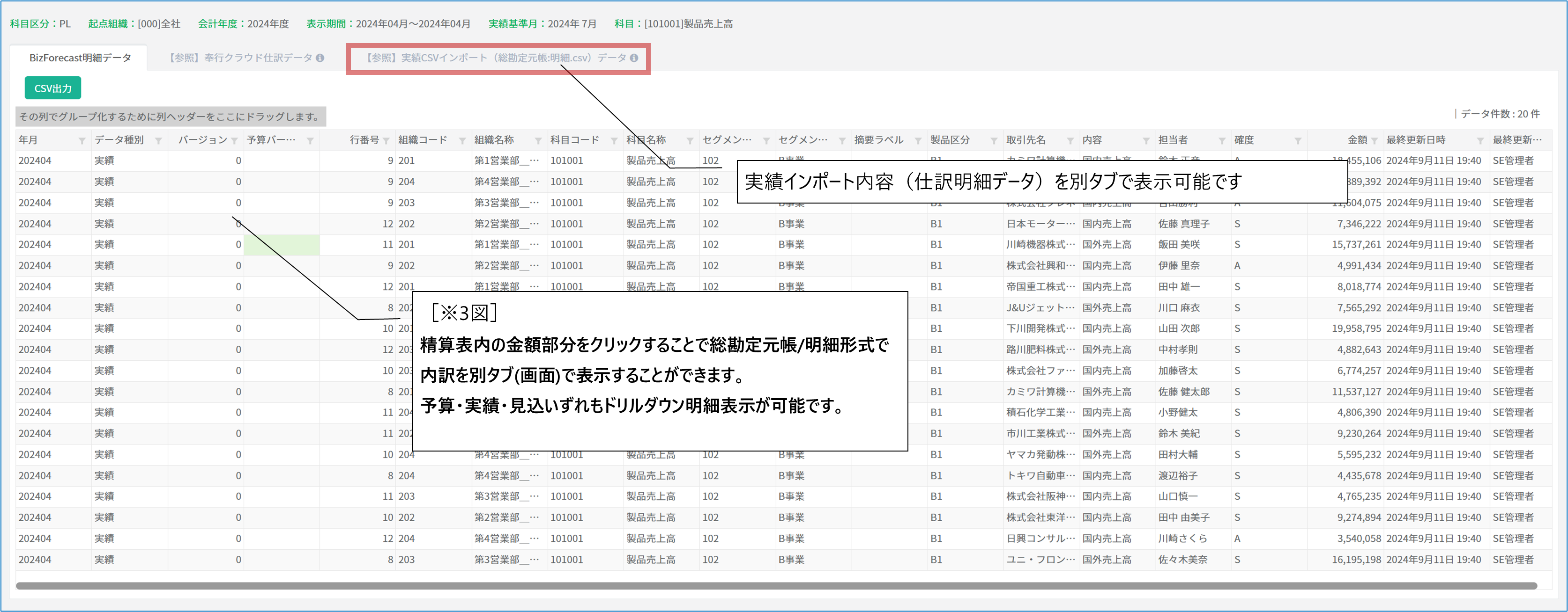 予算・実績・見込いずれもドリルダウン明細表示が可能です。(以下は実績データの金額リンクをクリックし、明細表示を行った例)