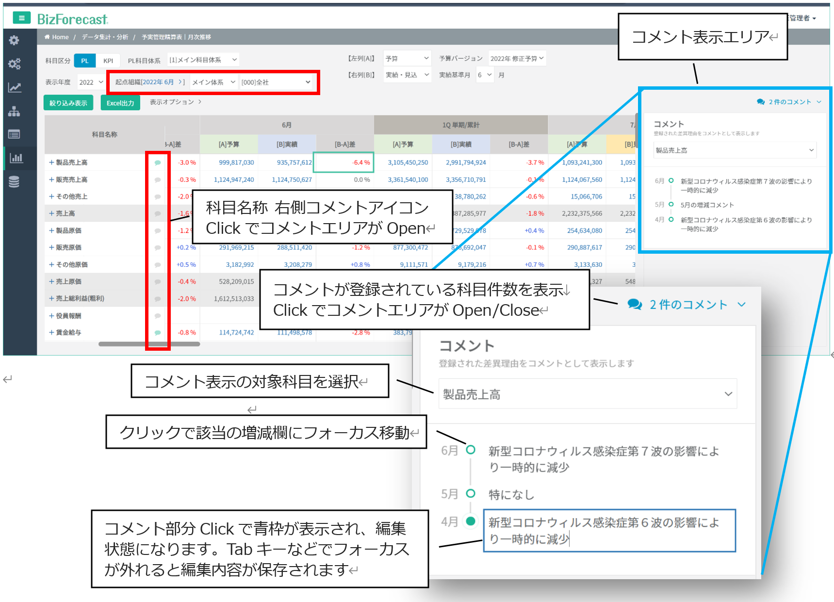 ※ コメント機能は、科目区分「PL」でのみ利用可能です。KPI(科目)ではコメントの登録・編集はできません。