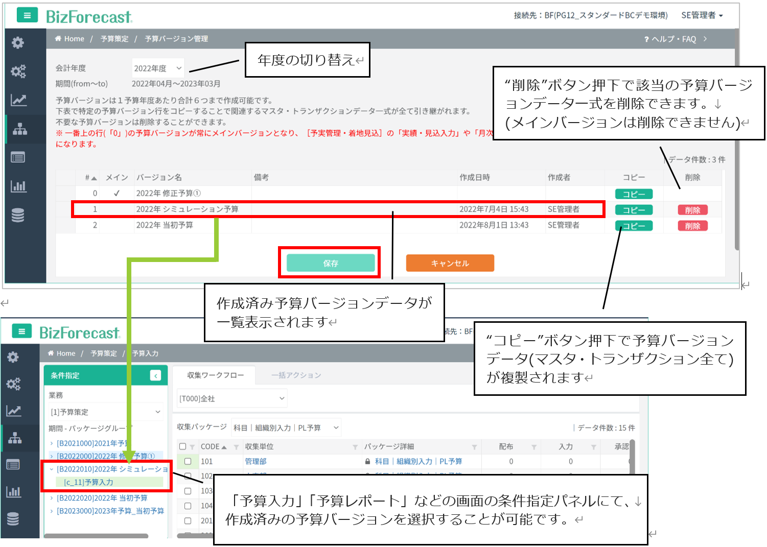 新たな予算バージョンデータについては、「予算策定 >> 予算入力」や「予算策定 >> 予算レポート」の各機能画面よりデータの編集が可能です。