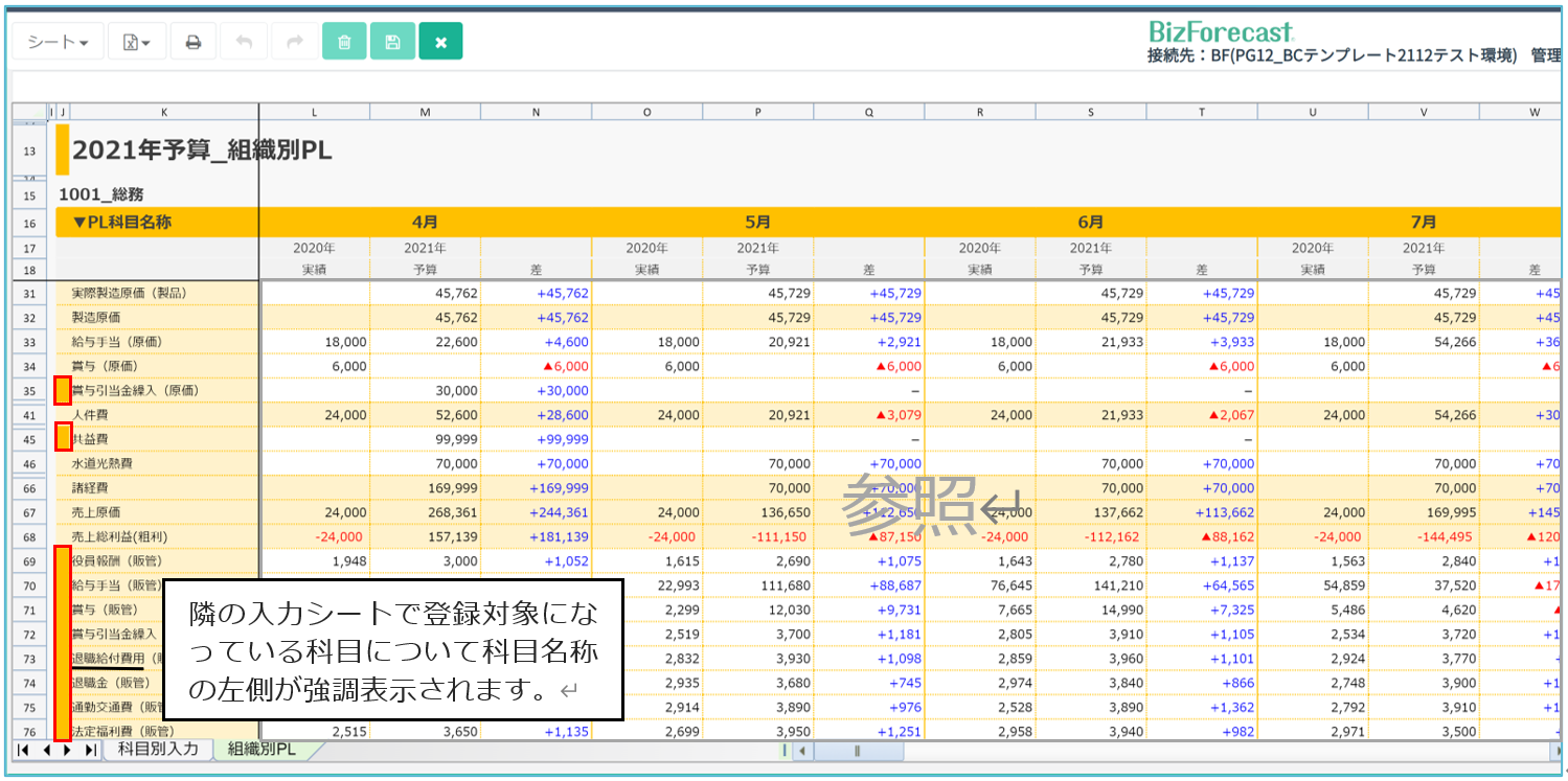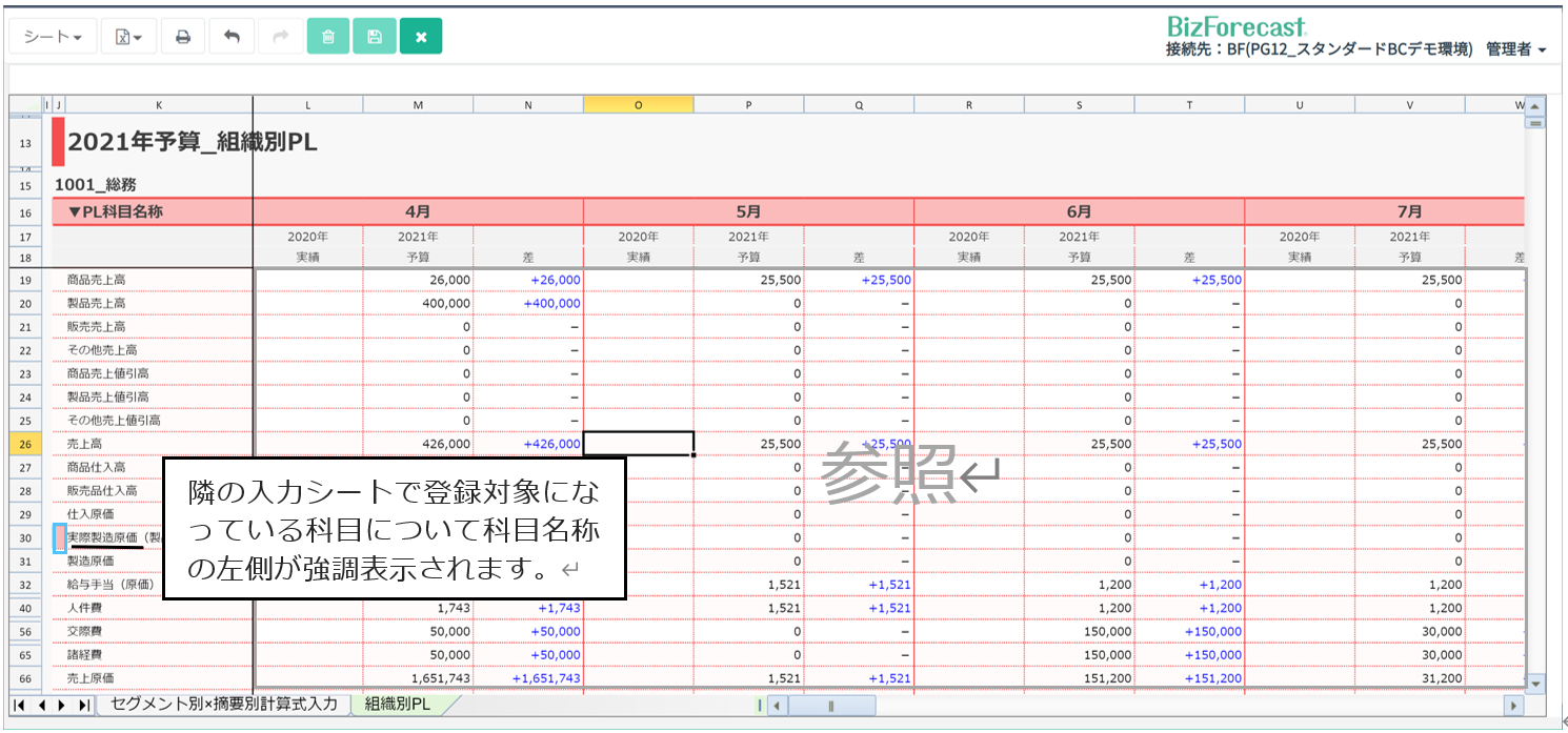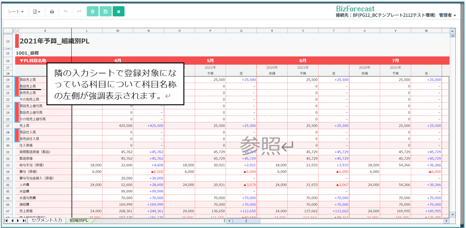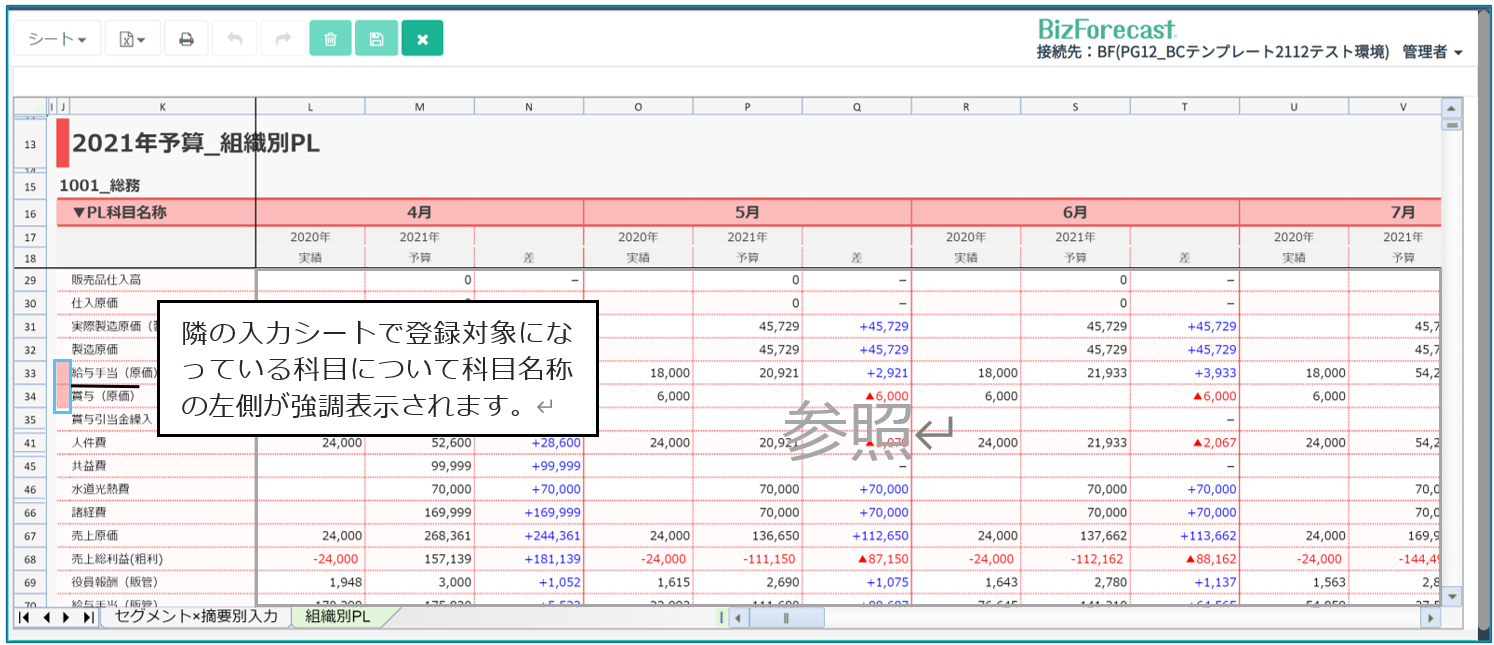 上記入力シートにて登録した値を含む、すべてのデータ登録済み科目をPL形式で表示した組織別PLシートです。