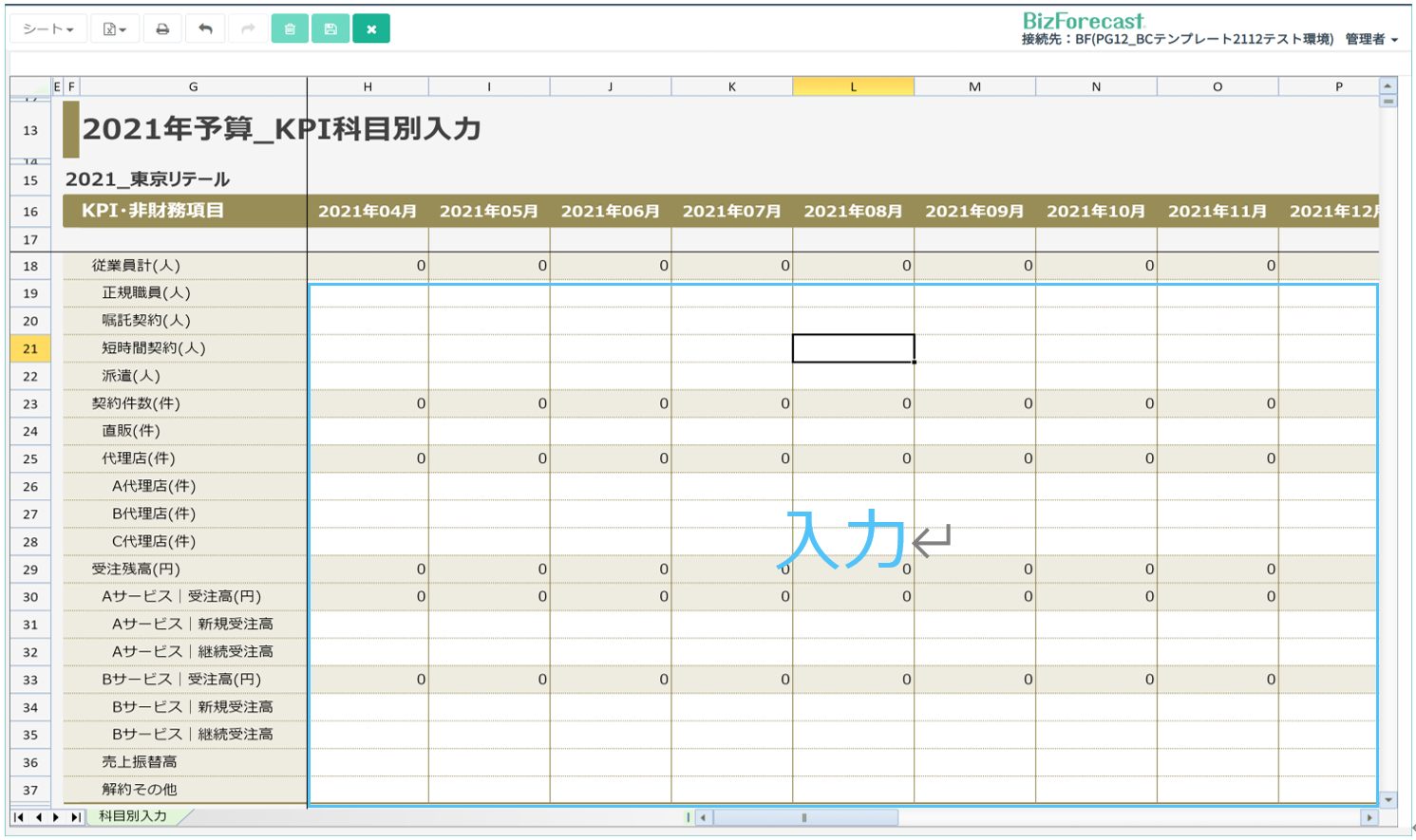 「期別マスタ >> 科目別予算登録方式設定」PLタブにて[科目|組織別入力]を選択した科目のみ、当シートに入力対象科目として表示されます。一番右の列に予算登録金額に関するコメントを科目別に登録することも可能です。
