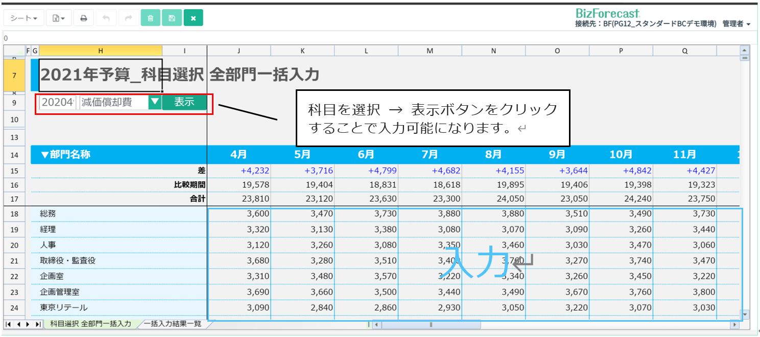 「期別マスタ >> 科目別予算登録方式設定」にて[科目|一括入力①~③]を選択した科目のみ、当シートにて入力対象科目として選択可能になります。科目選択した上で「期別マスタ >> 予算比較業務設定」で設定した各月の比較対象業務の金額を参照しながら部門毎の予算(負担)金額やコメントを登録します。