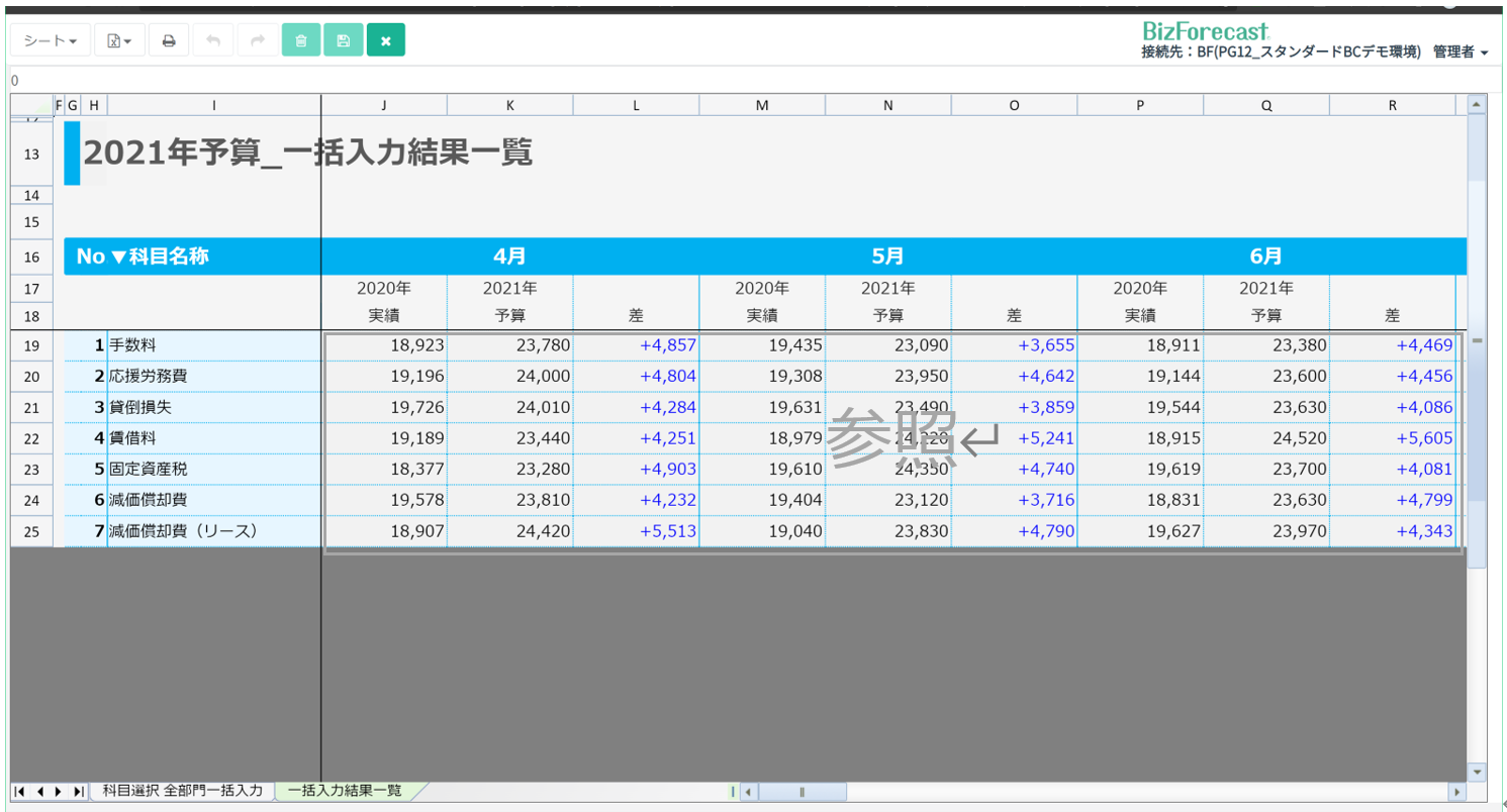 一括入力対象科目の全社合計金額を月別に表示する参照シートです。