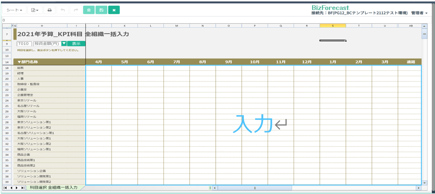 科目 KPI | 科目|一括入力|KPI予算 | 特定部門(担当者)がまとめてKPI科目の予算登録をします。 <シート構成> (1) 科目選択 全組織一括入力 ※入力シート |
