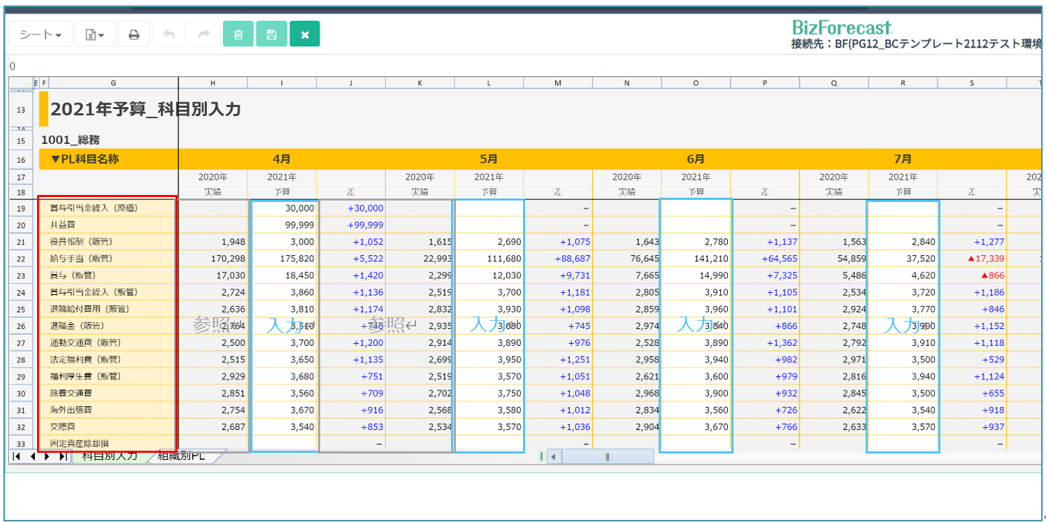科目 PL | 科目|組織別入力|PL予算 | 組織(部門・拠点)ごとに分散入力でPL科目別予算を登録します。 <シート構成> (1) 科目別入力 ※入力シート(金額+コメント) (2) 組織別PL ※参照シート |