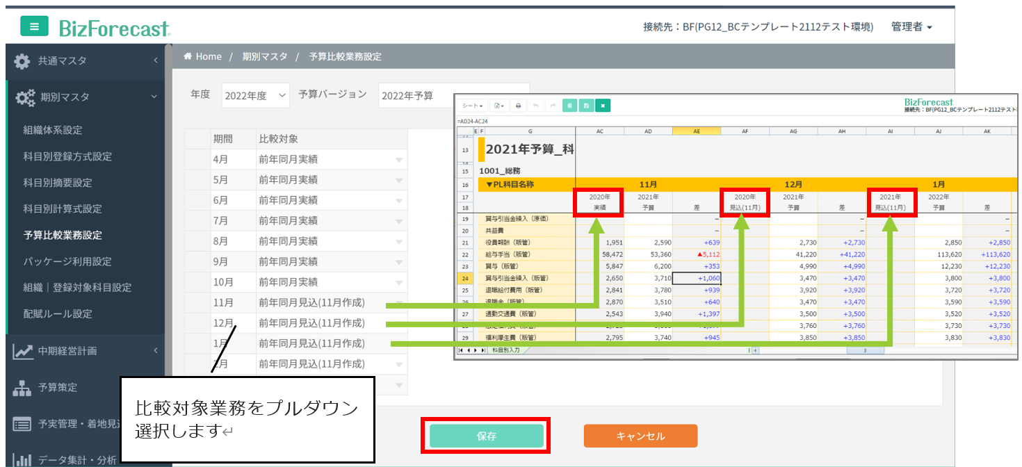 あるため、前年同月見込や前々年同月実績を比較対象業務に指定することが出来るようになっています。