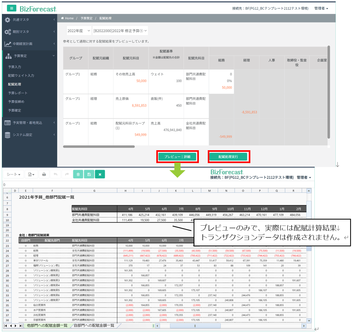 「プレビュー|詳細」ボタン押下で、スプレッド形式の配賦処理結果の