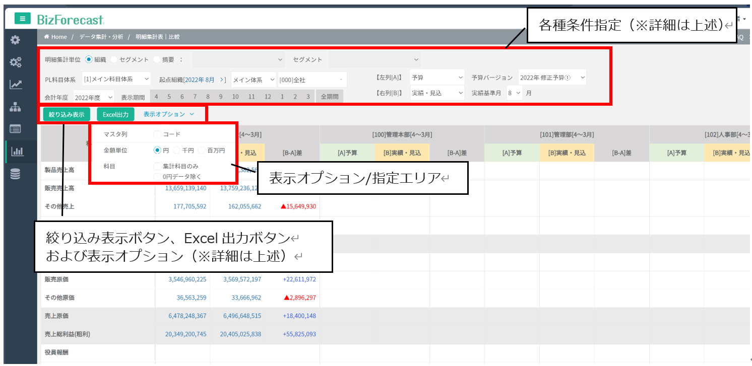 「予算策定」で登録した各種予算データ、「予実管理・着地見込」にて登録した(インポートを含む)実績および見込データについて、精算表(試算表)形式で指定された条件に応じて表示・分析するための機能です。