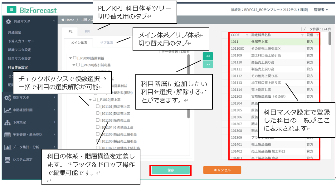 画面中の矢印のようなボタンにて科目を体系ツリーに追加し、必要に応じてドラッグ&ドロップ操作で階層構造を設定します。チェックボックスで複数科目選択し、一括で選択解除することも可能です。