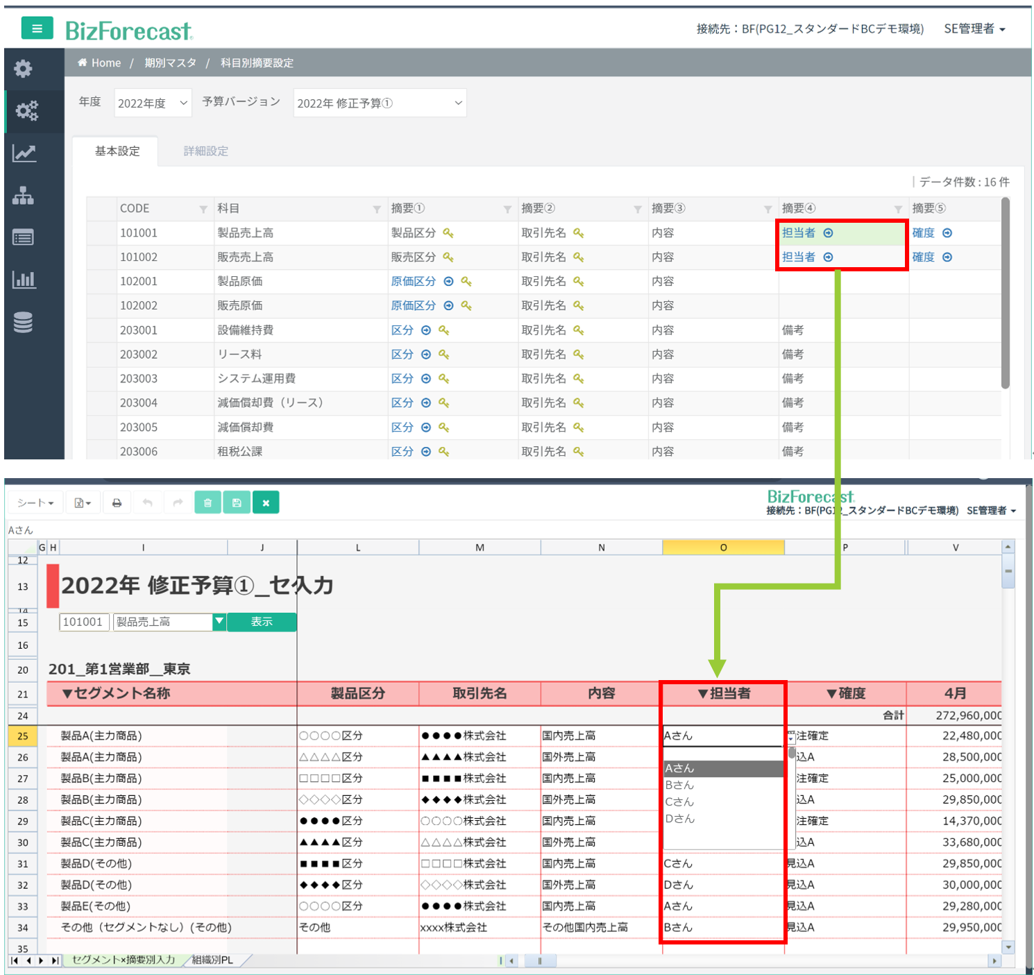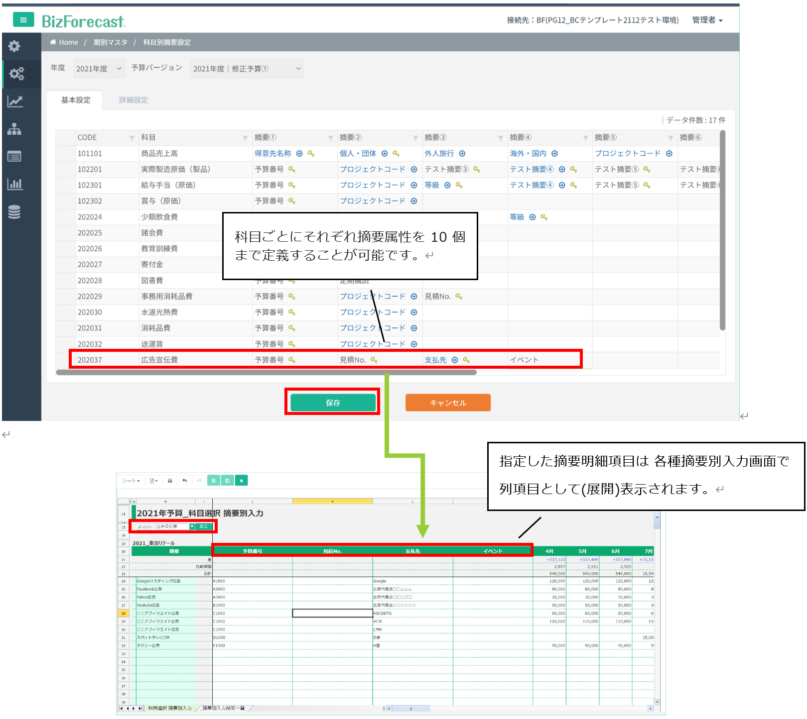 摘要タイトルを同一文字列にすることで、科目横断の(共通)摘要属性として扱うことが可能になります。ここで設定した摘要属性項目が、予算/見込登録時の入力画面において、列項目として表示されます。