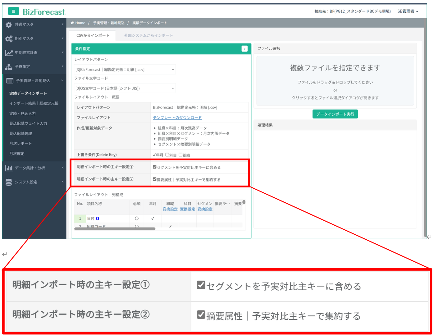 [予実管理・着地見込]>[実績データインポート]機能画面において、「[3] BizForecast|総勘定元帳:明細[.csv]」選択時に、上記設定に従って実績インポート実行時に“予実対比主キー“の設定内容に従って明細データの集約を実施するか否かを指定できるようになっています。