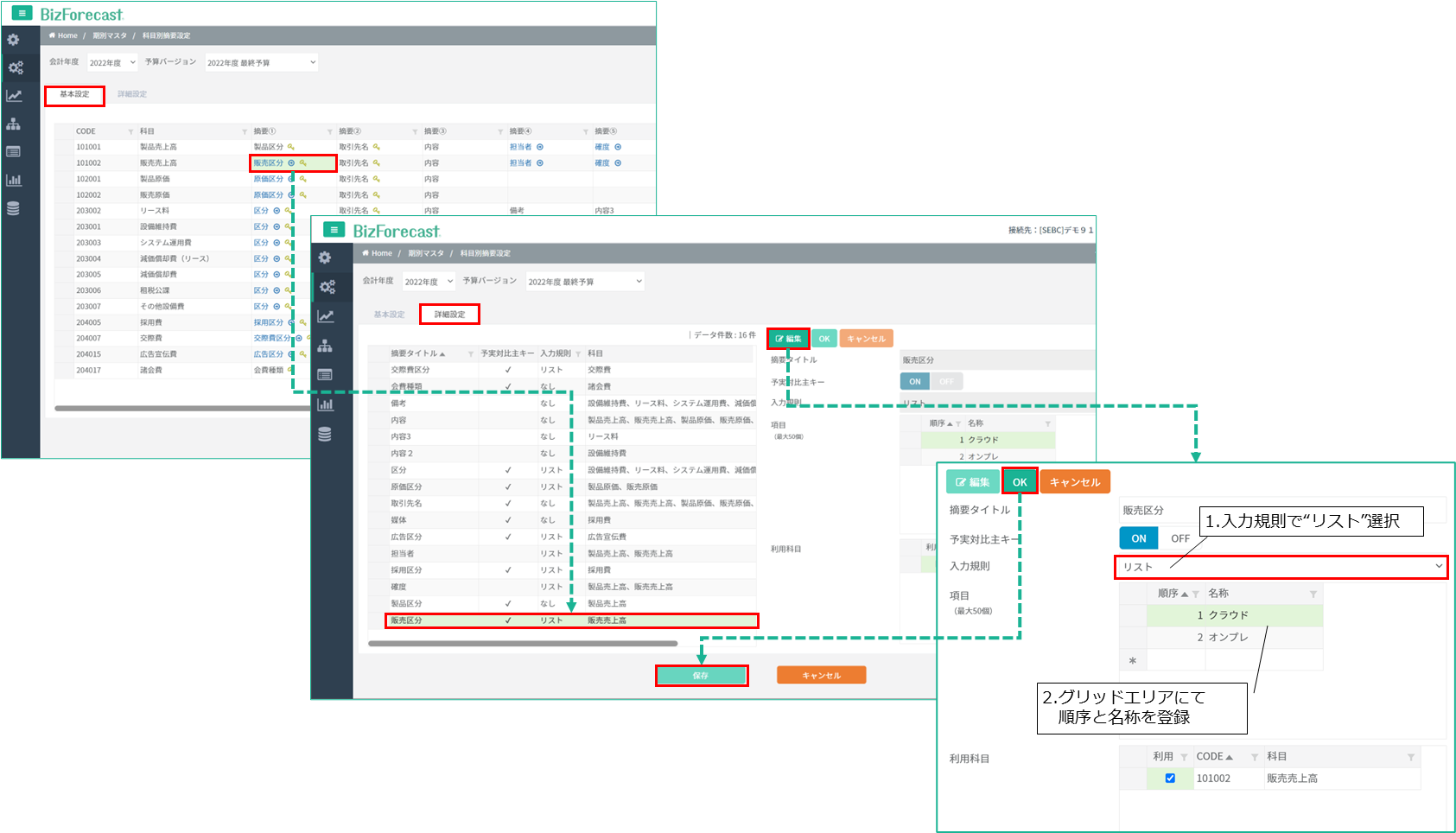 (4) 入力規則:“リスト“に設定された摘要項目は、青字で右側に矢印マークが付いた書式に変わり、クリックすると「詳細設定」タブのリスト項目編集に遷移するようになります。摘要項目の文字列(ラベル)が同一のものは、同一の摘要属性項目として認識されます。