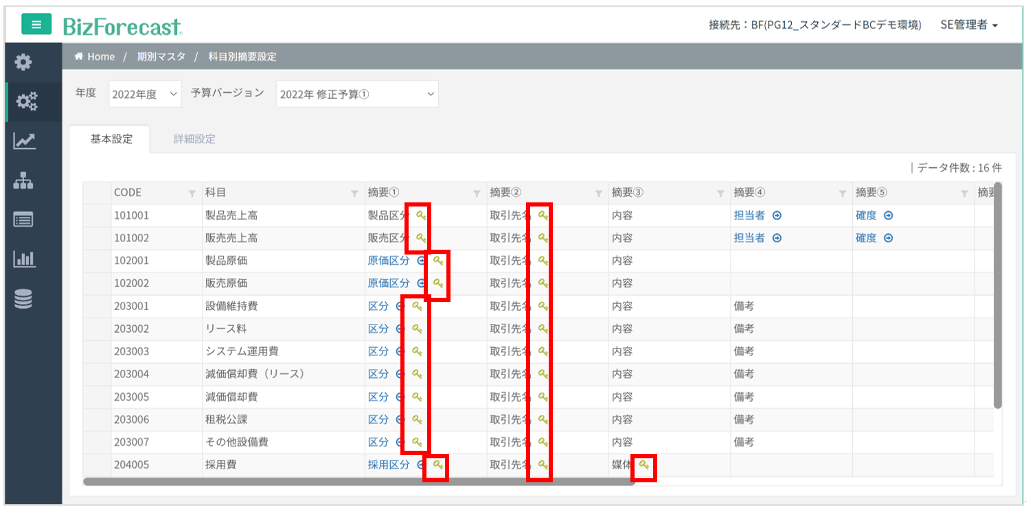 予実対比主キーが有効な“On”項目は、基本設定タブの方で摘要属性タイトル文字列の右横に鍵マークが表示されます。