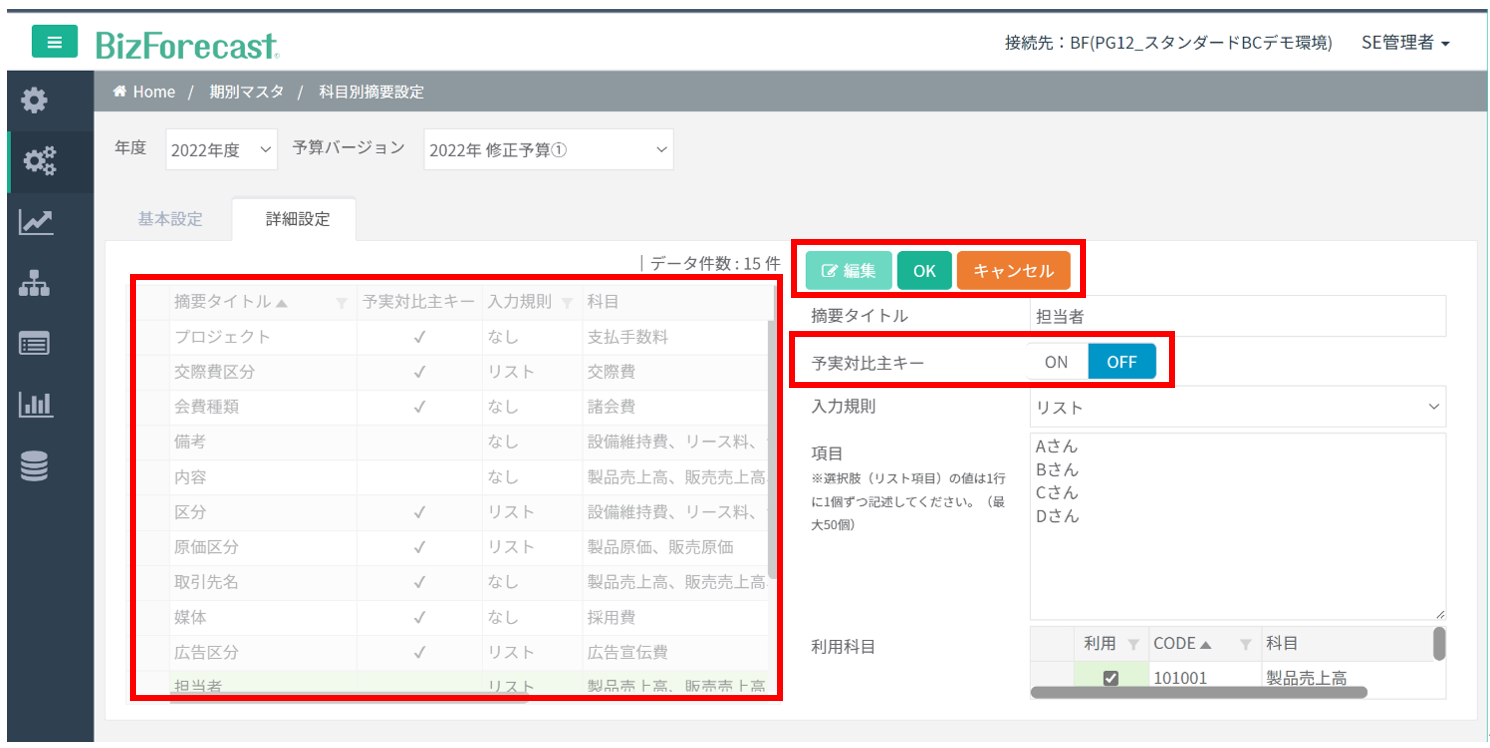 予実対比主キーの設定をする際は「詳細」タブの方で、① 設定対象の摘要項目を選択 ⇒ ②「編集」ボタン押下 ⇒ 予実対比主キーの[On|Off]を設定 ⇒ 「OK」ボタン押下 ⇒ 画面下部の「保存」ボタンを押下します。