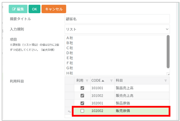 ※ リスト選択式の摘要項目を削除(解除)するには、“詳細設定”タブで該当のリスト項目を選択した上で、“編集”モードにして解除したい勘定科目のチェックを外して保存してください。