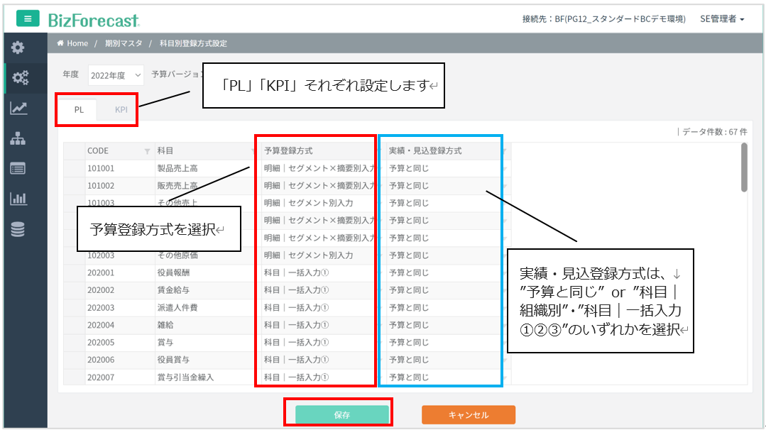 科目ごとにどの登録方式で予算データを入力するか選択します(指定した科目のみ予算データ登録が可能になります)。