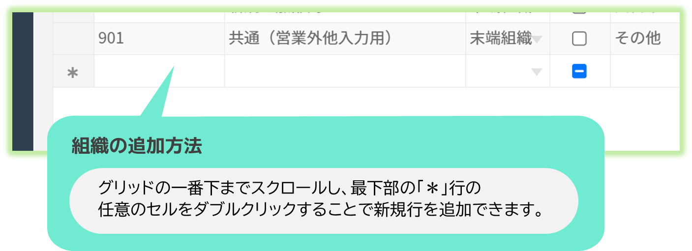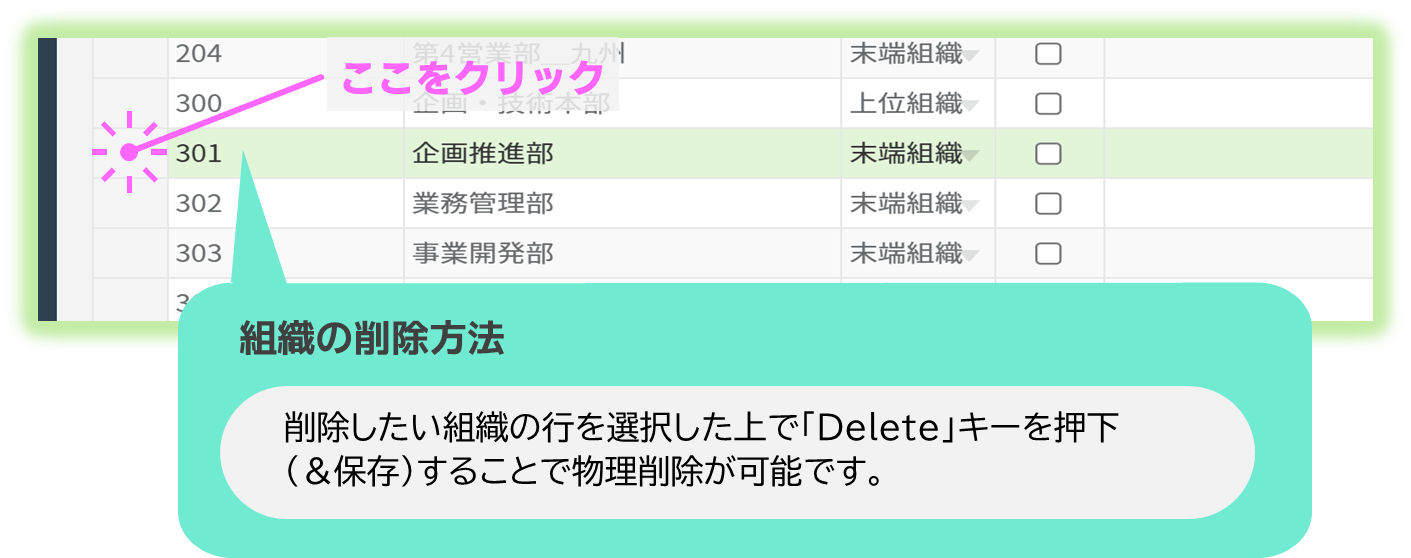 削除したい組織の“廃止”列にチェックを入れることで論理削除することができます(レポートや精算表等に表示されなくなります)。