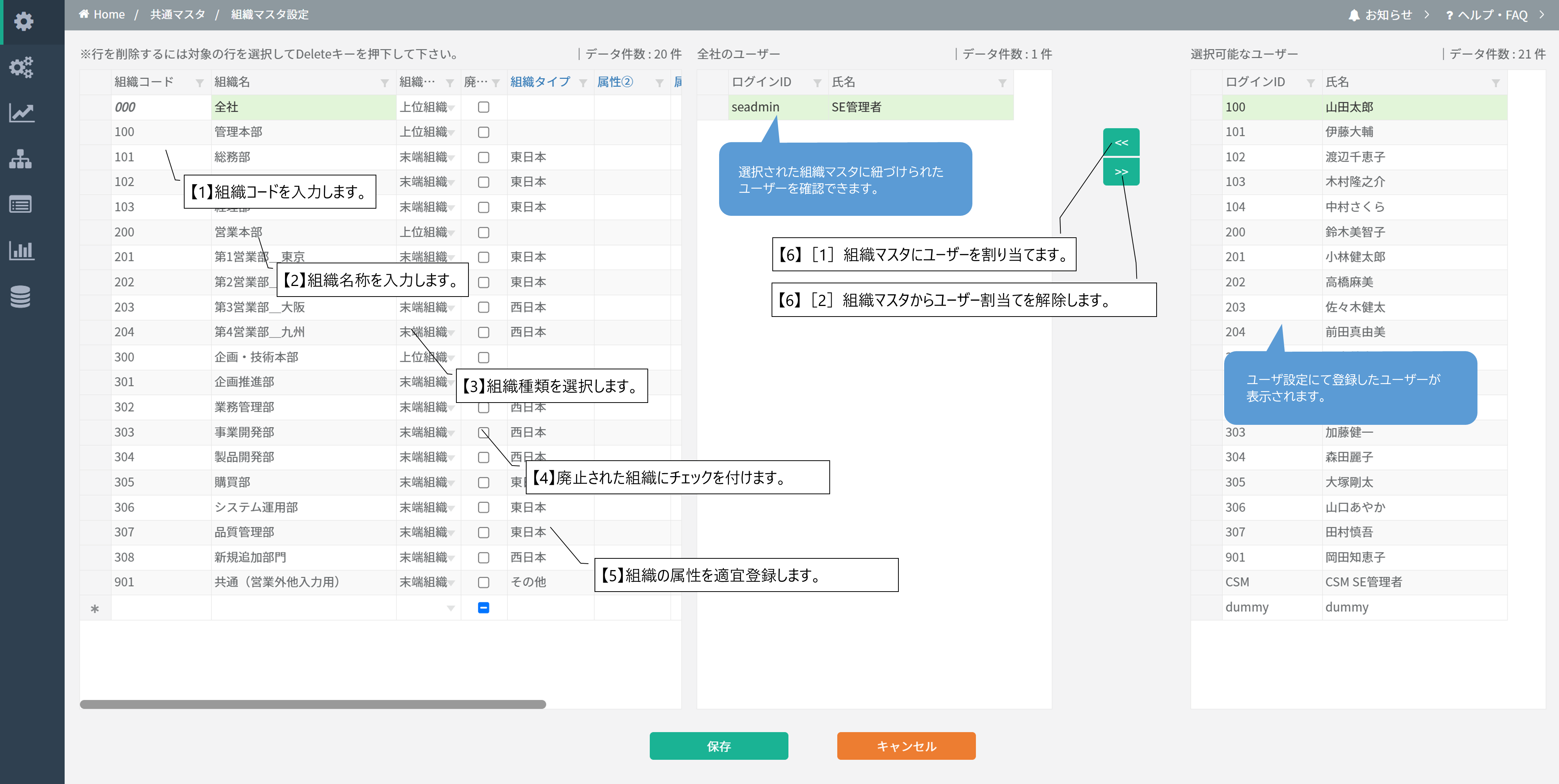 各組織に紐づくユーザーの割り当て・割当解除を行います。