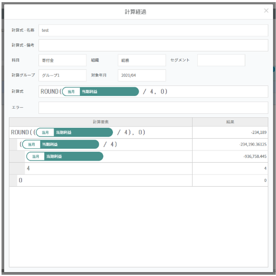 上記の例では、当月の当期利益が4で除算され、さらに四捨五入して整数にしています。その計算の経過がツリー状に表示され、どの順序で処理されているかを確認することができます。
