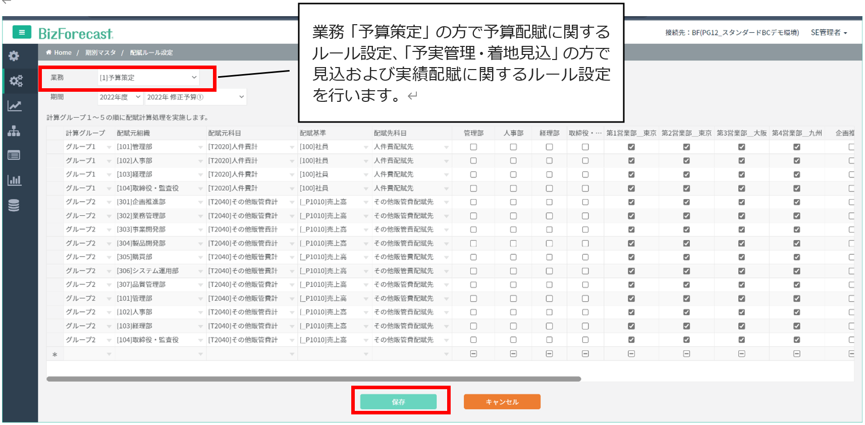 1~5のグループ単位で段階的に配賦計算処理が実施されますので、多段階配賦が必要な場合にはグループを分けてルール定義します。