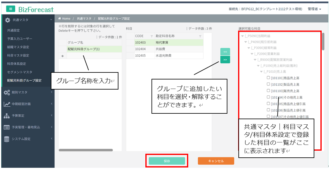 配賦ルール設定において、このグループ化された科目群を配賦元として一括指定することができるようになります。