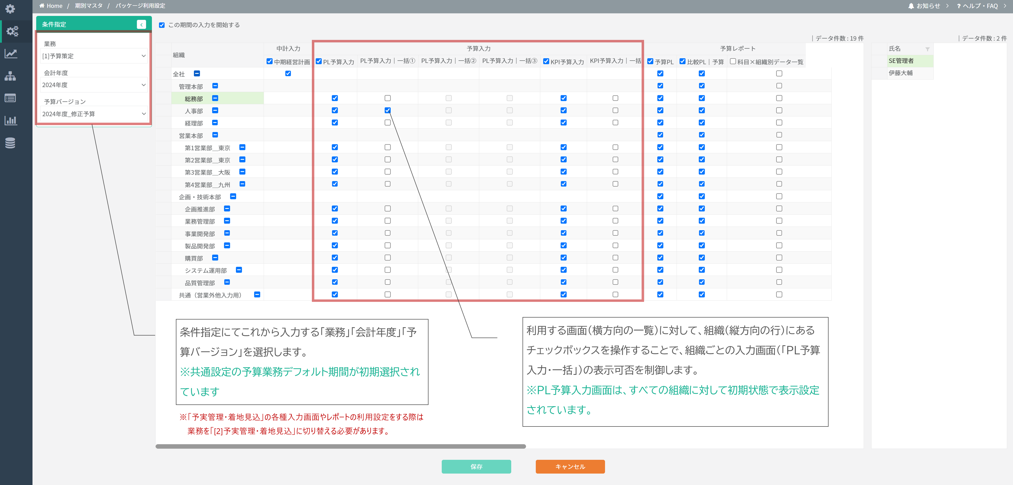 BizForecast BC Standardでは、予算管理方針に応じて勘定科目ごとに様々な予算入力(登録)方式を選択いただけるよう、多くのパッケージ(入力フォーマット)種類を用意しています。 科目ごとにどのパッケージで予算登録するかについては、「期別マスタ >> 科目別登録方式設定」画面で設定します。 組織別予算入力画面について (例)PL:組織別入力 収集単位第一営業部東京がアクセスした例 ※表示オプションの制御項目 ◆明細予算入力[1] 明細|セグメント×摘要別入力 ...
